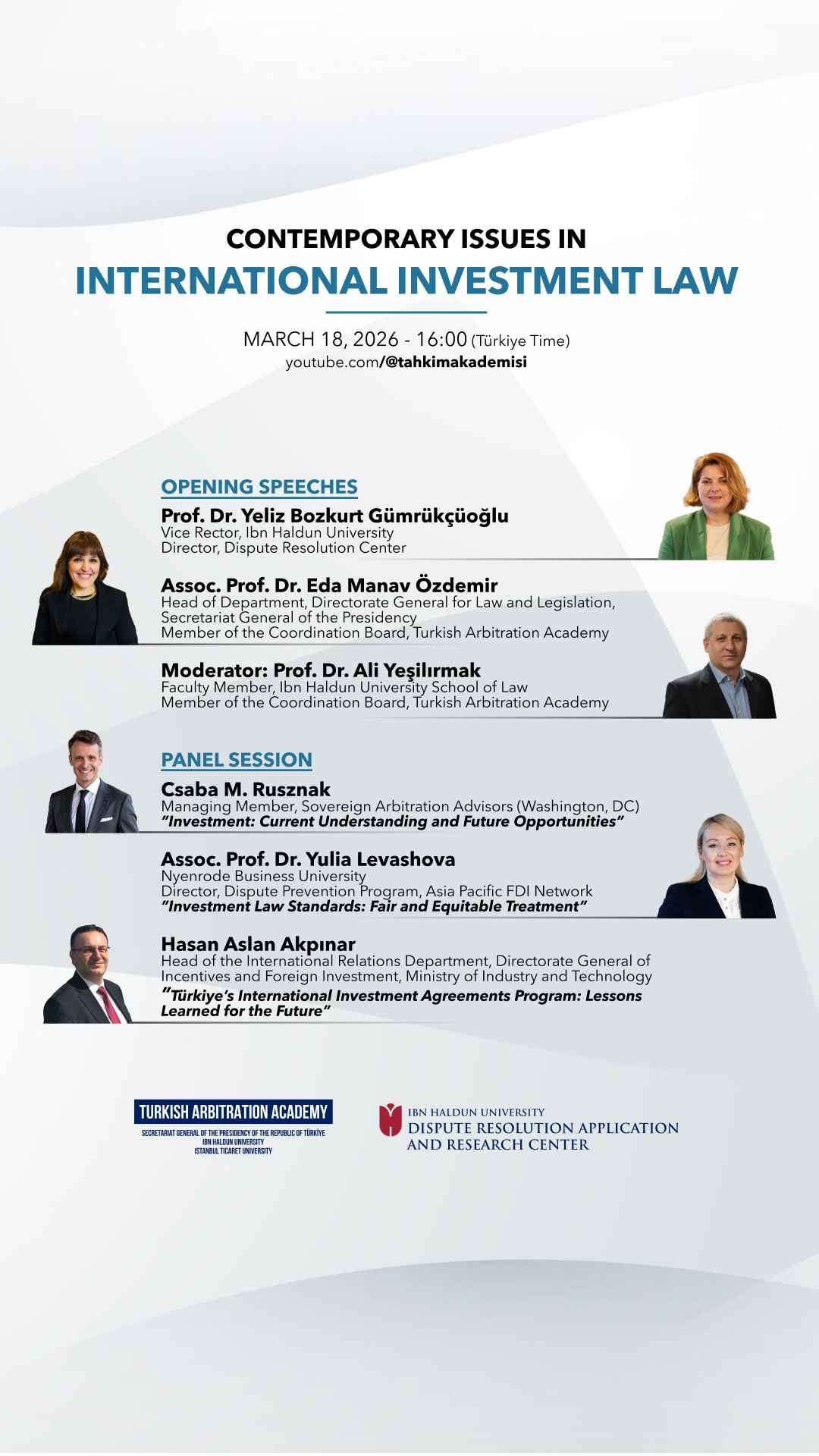 İbn Haldun Üniversitesi Uyuşmazlık Çözümü Uygulama ve Araştırma Merkezi (UÇAM) ile Turkish Arbitration Academy iş birliğiyle düzenlenen “Contemporary Issues in International Investment Law” başlıklı çevrim içi etkinlik, 18 Mart 2026 tarihinde gerçekleştirilecektir.